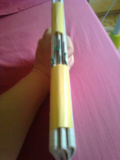 Luego cogí las hojas del cuaderno y las fui cosiendo, después de coserlas le puse cinta de doble cara y la pegue al lomo de las hojas.
